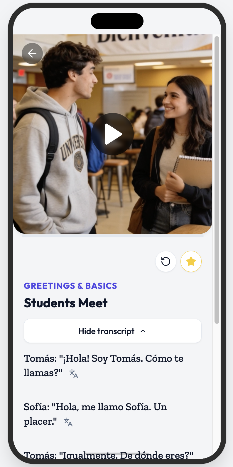 Train your brain with simple, fun video scenes. No more gamified vocabulary drills—just simple conversations made for real-word use.